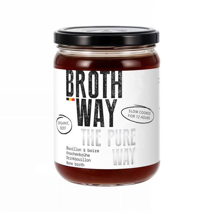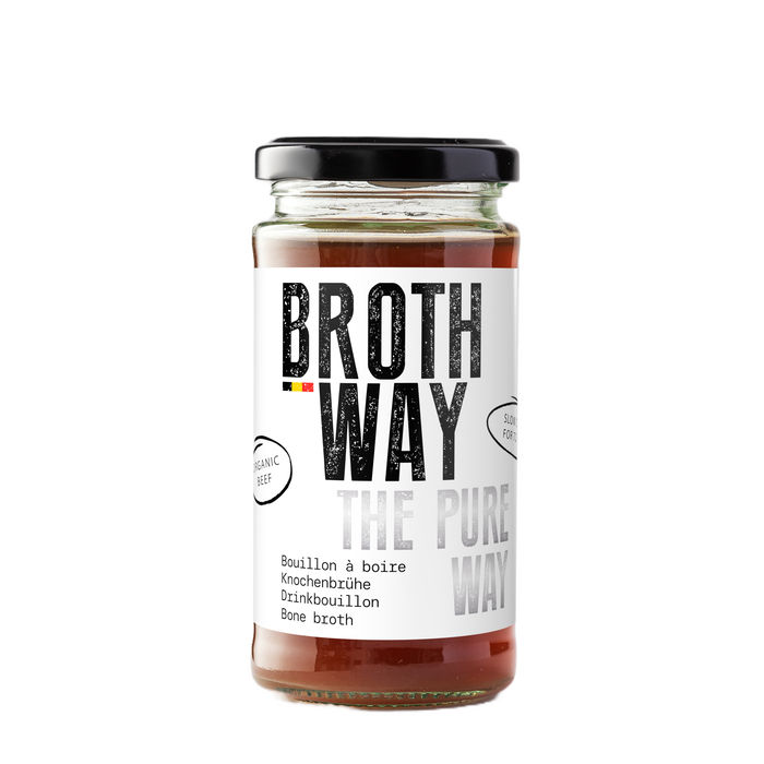 De Pure Way bouillon wordt langzaam getrokken uit zorgvuldig geselecteerde runds- en kalfsbeenderen. Dankzij het artisanaal kookproces komen de rijke smaken en voedingsstoffen volledig vrij. Het resultaat is een heldere, pure bouillon met een hoog gehalte aan collageen en eiwitten, zonder toevoegingen of overbodige ingrediënten.