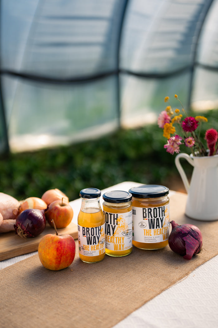 Water, kippenbeenderen* (47,8%), ui*, wortel*, gember*, appelciderazijn*, zout, peper*, kurkuma*(0,02%)
